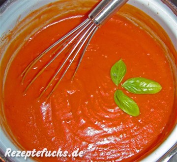 Das Öl in einen kleinen Topf geben und erhitzen. Mit dem Schneebesen das Mehl einrühren. (Die berühmte "Mehlschwitze"). Unter ständigem Rühren (sonst klumpt es) mit Tomatensaft aufgießen (je nachdem, wie flüssig eure Soße werden soll, könnt ihr noch mehr Tomatensaft reinschütten). Mit Kräutern und Gewürzen abschmecken.